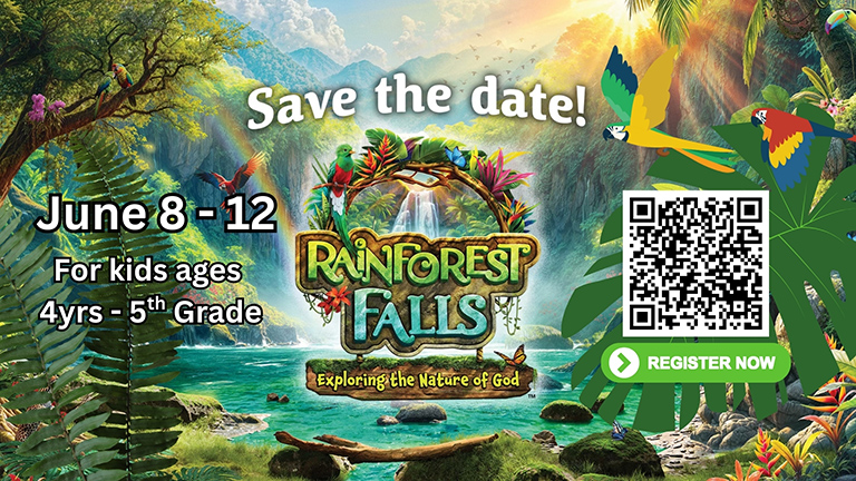 Step through the mist into Rainforest Falls—a vibrant, adventure-filled world overflowing with wild waterfalls, towering trees, and colorful creatures. Beneath a canopy of chattering birds and howling monkeys, kids will plunge into a meaningful journey of faith, fun, and discovery.